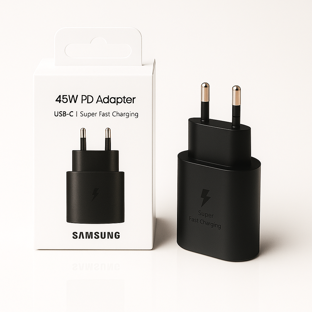 Charge smarter, faster, and safer with the Samsung 45W PD Adapter — engineered for high-speed USB-C Power Delivery. This adapter ensures efficient, heat-controlled charging for phones, tablets, and even laptops that support PD protocol.